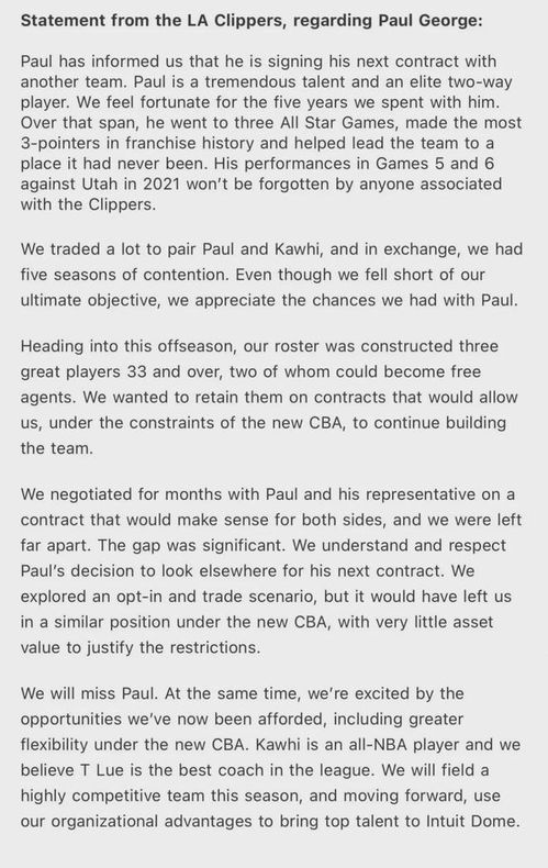 乔治表示自己是想要留在快船的,但是,快船给出的2年6000万美元的合同报价,是对他极其不尊重。