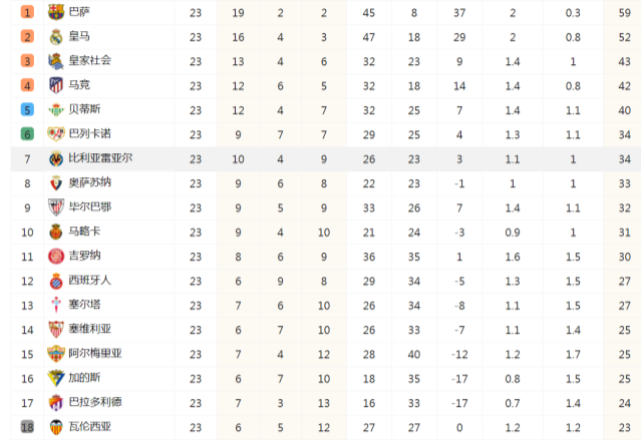 | 2 | 皇家马德里 | 10 | 7 | 2 | 1 | 21 | 9 | 12 | 23 |