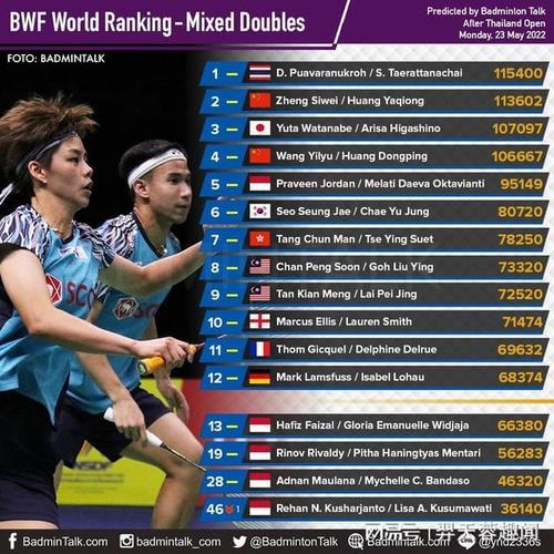 排名更新通常每两周进行一次,具体每位选手的排名会根据他们在各大公开赛和积分赛中的表现进行调整。如果你需要最新的排名,建议访问BWF官方网站或者关注相关体育新闻以获取最新信息。